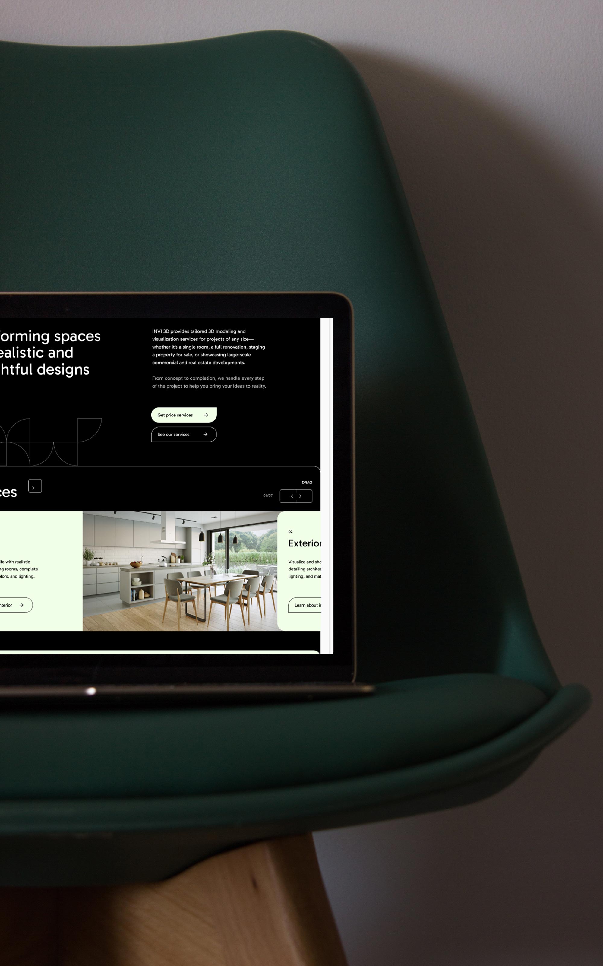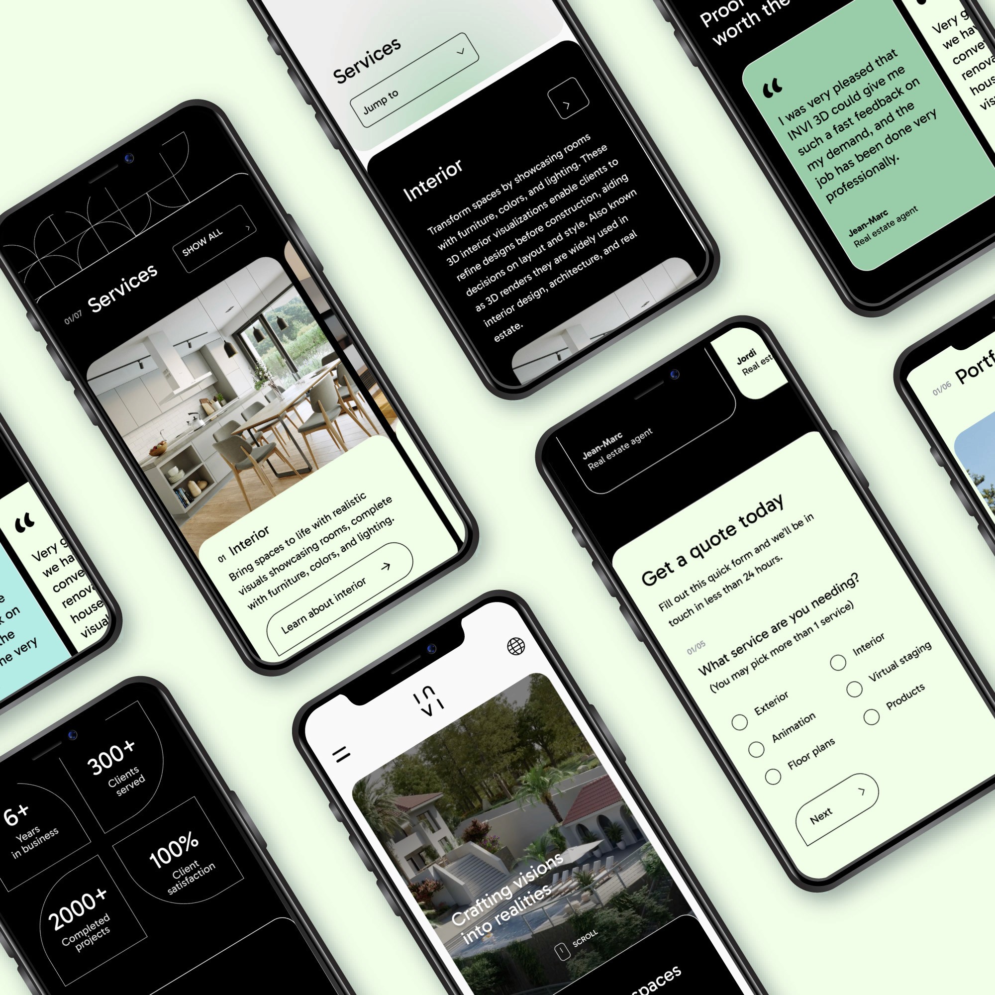Invi3D is a 3D visualization studio specializing in high-quality renderings and virtual experiences for real estate and product design. They approached me to refresh their brand and completely redesign their website. The goal was to elevate their digital presence to better reflect the sophistication of their work and clearly communicate the full range of their services—including interior and exterior renders, 3D animation, virtual staging, and more. A key business objective was to drive more leads through the “Request a Quote” form.